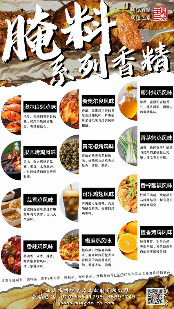 烤肉香精領(lǐng)域我們潛心專研,結(jié)合市場潮流,消費者喜好,汕頭市明德食品添加劑有限公司現(xiàn)有多種烤肉相關(guān)風味的香精,供您選擇。并持續(xù)努力研發(fā)更多符合市場需求的風味。